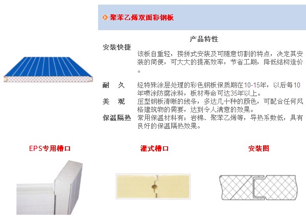 應(yīng)用于組合冷庫(kù)上的夾芯板分為兩種類型,分別為聚氨脂夾芯板和聚苯乙烯夾芯板,由于聚氨脂夾芯板的強(qiáng)度、隔熱等性能優(yōu)于聚苯乙烯夾芯板,所以聚氨脂夾芯板通常多應(yīng)用于速凍或庫(kù)溫較低的低溫庫(kù)上,聚苯乙烯夾芯板則由于隔熱性能較好且價(jià)格適中而通常多應(yīng)用于普通低溫冷庫(kù)、高溫冷庫(kù)和食品加工廠等工業(yè)與民用建筑上。這兩種夾芯板的綜合性能詳見附圖和附表。由于上述兩種夾芯板所具有的優(yōu)良性能,因此可被廣泛應(yīng)用于工業(yè)與民用建筑的其它各領(lǐng)域。